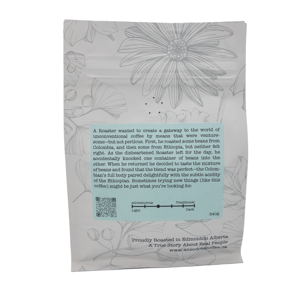 A Roaster wanted to create a gateway to the world of unconventional coffee by means that were venturesome—but not perilous. First, he roasted some beans from Colombia, and then some from Ethiopia, but neither felt right. As the disheartened Roaster left for the day, he accidentally knocked one container of beans into the other. When he returned he decided to taste the mixture of beans and found that the blend was perfect—the Colombian’s full body paired delightfully with the subtle acidity of the Ethiopian.